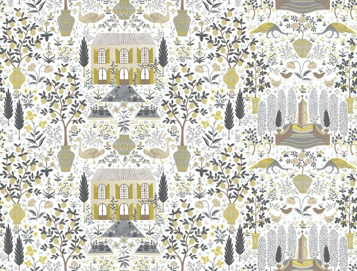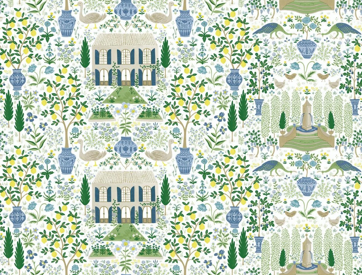 Inspired by a property of the same name in Gascony, France and an antique pattern from York’s archives, the Rifle Paper Co. Camont print features an illustration of an 18th-century French farmhouse and the fig trees, lemon trees, animals and flowers of it’s pastoral grounds.