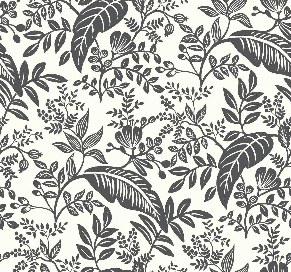 Tropical leaves and greenery are layered to create Canopy, a lush, two color print from Rifle Paper Co. that is both modern and sophisticated.